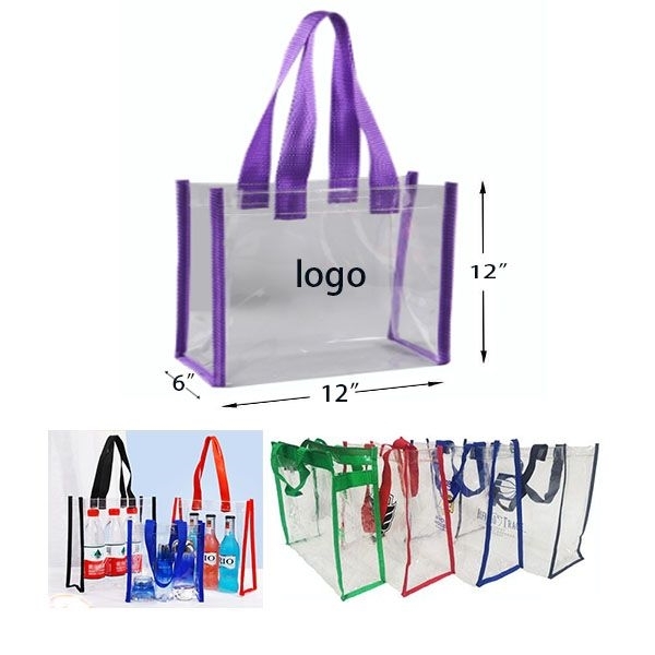 Our bag is made of PVC. The size is 12"L*6" W*12"H. The transparent everyday tote is a stylish bag you can use to carry your important belongings in for the day. Make sure that this bag is clean by spot-cleaning all of its dirty areas and then air drying it afterward.