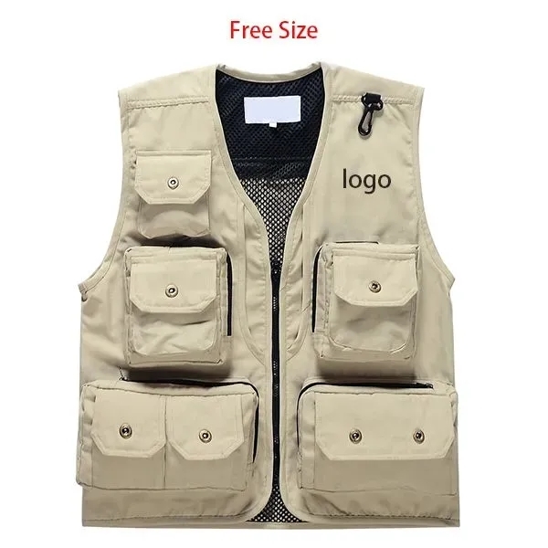 Our Fishing Vest with Multi Pockets's material is Cotton + Nylon, size is free size. Support customized yours logo. Why go trolling for a great fishing gear promotion?Reel them in with a gift of these great vests.these accessories have in assorted shapes and sizes to hold all kinds of gear,from hooks to lures, sinkers, bait and more. for even cooler wear. Great for hiking,biking and camping. you're sure to find a great fit for everyone on your list. Available in assorted colors. Add your organizational or company logo or message to customize