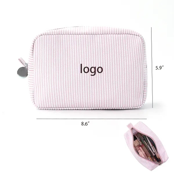 Our Striped Travel Cosmetic Bag's material is polyester, size is8.6" W x 5.9" H. Support customized yours logo. Our stylish makeup bag is made of high-quality polyester material, which is durable. The smooth zipper with fashionable stripe design gives the makeup bag a modern and elegant look. It can be used as a travel essential, daily wallet organizer, makeup bag, travel accessories bag, or toiletry bag. Not easy to collapse and not easy to deform. It can easily store daily makeup essentials such as brushes, eyeliners, lipsticks, foundation, and other small items. The makeup bag is the best gift for female friends. It is very suitable for birthdays, Christmas, Halloween, Valentine's Day, and daily life. Add a custom logo for a great promotional item for year round brand exposure.