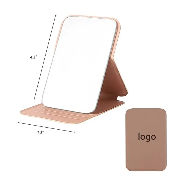 Our Rectangle Folding Mirror's material is Frame material pu, lens material silver mirror, size is 4.3" H x 2.8" W. Support customized yours logo. This portable mini mirror is made of a comfortable PU cover. Unbreakable and durable. These handy travel mirror is suitable for makeup before meetings, parties, concerts, after the gym or on the go, the mini mirrors can be placed in any small bag, backpack, handbag, and cosmetic case. Small makeup mirrors suitable for women and men of all ages; perfect for birthdays, Mother's Day, Christmas, Valentine's Day, Halloween, anniversary.