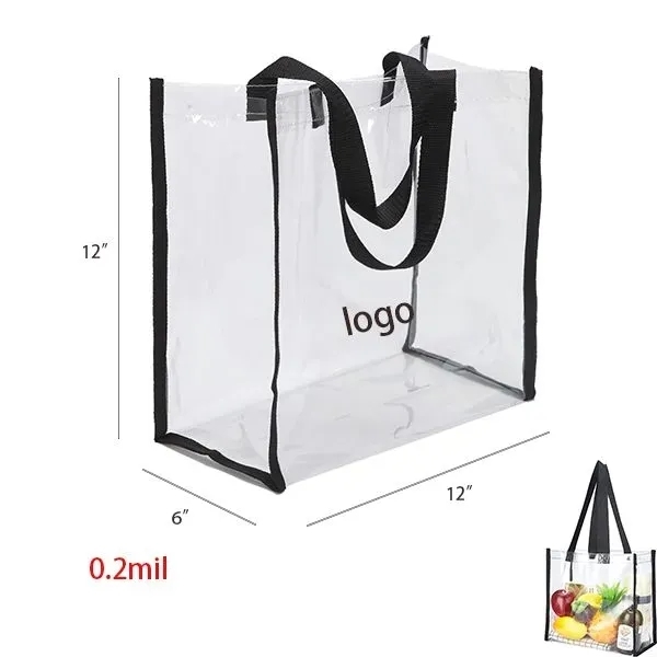 Our PVC Clear Tote Bags's material is pvc, size is 12" H x 6" W x 12" L. Support customized yours logo. Be concert-ready with this clear tote bag with a corporate logo! This see-thru tote provides ample space for your phone, clothes, crafts, wallet, keys, and other essentials. It measures approximately 12" x 6" x 12" ,The transparent design allows for effortless security checks, saving time and eliminating the hassle of rummaging through your bag. Reinforced handles ensure easy carrying and can withstand heavy loads without tearing or stretching. Made from durable PVC material, this bag is resistant to deforming, fading, and tearing, ensuring long-lasting use. The smooth, waterproof surface repels liquids and is easy to clean with a damp cloth.