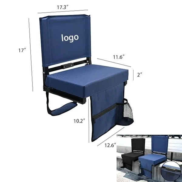 Our Portable Stadium Chair's material is Steel pipes and Oxford cloth, size is 17" H x 17.3" W. Support customized yours logo.Transform those hard bench seats in stadiums, ballparks and concert halls into the best seats in the house with these folding accessories with added back support. With an aluminum frame and a padded seat and back, these 17" x 17.3" chairs have hooks to make for a safer connection with bleachers and other types of seating. Folds up so it's always easy to bring along. Available in assorted colors. Add your school, sports team, organizational or company logo or message to customize.