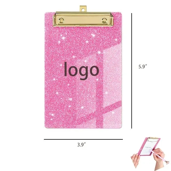 Our Glitter Acrylic Office File Clipboard's material isABS, size is 3.9" W x 5.9" H. Support customized yours logo. Elevate your workspace with our Glitter Acrylic Office File Clipboard! Sized at 3.9" x 5.9", it adds a touch of sparkle to your organization. Durable acrylic construction ensures lasting use, while the sleek design complements any setting. Stay stylishly organized with this eye-catching clipboard. Perfect for notes, memos, and more!