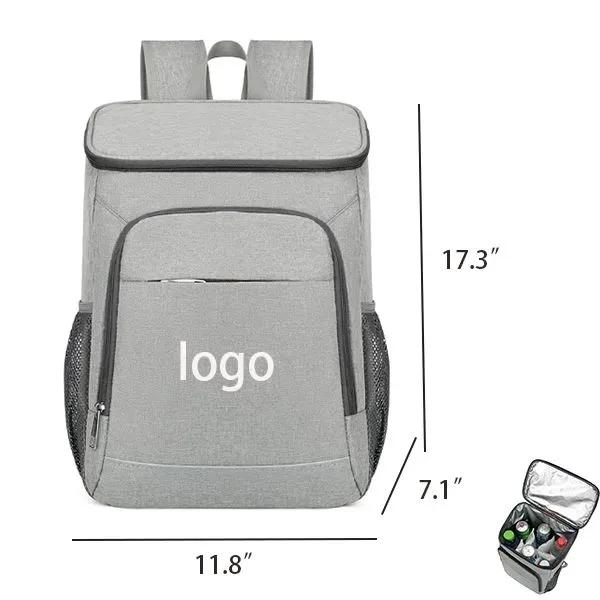 Our Can Cooler Backpack's material is oxford cloth, size is 11.8" W x 17.3" H x 7.1" T. Support customized yours logo. This Can Cooler Backpack from perfect blend of style and convenience,making it an ideal companion for your next adventure. Rugged construction with its water-resistant tarpaulin exterior and clean lines add to the appeal of this practical and stylish bag. Its spacious main compartment is deep enough to hold upright wine bottles and features thick foam insulation and heat-sealed PEVA lining to keep your items cool, it also has a large front zippered pocket, 2 side mesh pockets, top lid zippered accessory. Carry it using the top handle or go comfortably hands-free with the adjustable, padded mesh backpack straps.