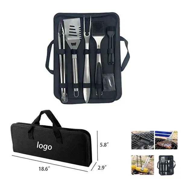 Our 7 Piece BBQ Set's material is stainless steel, size is 18.6" L x 2.9" W x 5.8" H. Support customized yours logo. This barbecue set includes 1 spatula, 1 fork, 1 pliers;1 shovel, and 2 cleaning brush heads to meet all your barbecue needs. All tools are made of stainless steel and secured in a zippered travel bag with elastic bands. The bag can be customized to your favorite pattern or your company's logo.